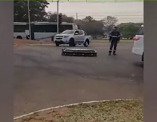 Caixão caiu na Avenida Gunter Hans, região do Bairro Aero Rancho, em Campo Grande, na manhã desta sexta-feira (13). Em horário de movimento intenso no trânsito, os agentes funerários nem perceberam o acidente e foram avisados por um motociclista. Então, voltaram para buscar o caixão.