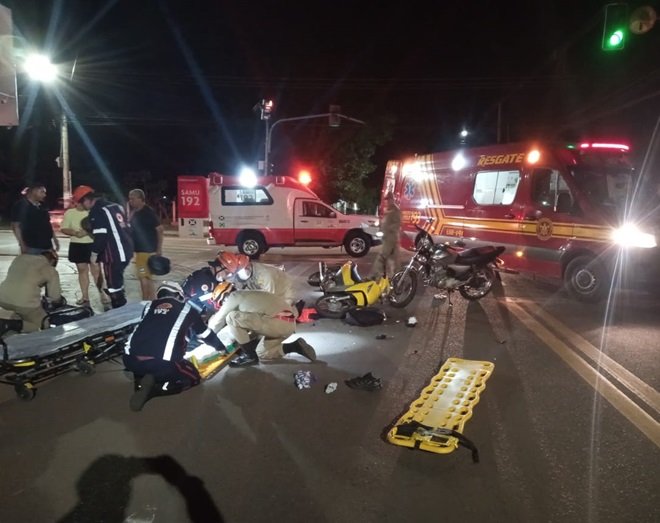Desta vez no cruzamento das ruas Giovani Toscano de Brito com Duque de Caxias a equipe constatou uma colisão entre duas motocicletas, uma Titan e uma Biz com duas vítimas no local.