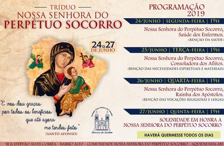 26/06 às 19hs Tríduo (Nossa Senhora do Perpétuo Socorro, Rainha dos Apóstolos: bênção das vocações religiosas e leigas)/Quermesse /Espaço Kids Gratuito;