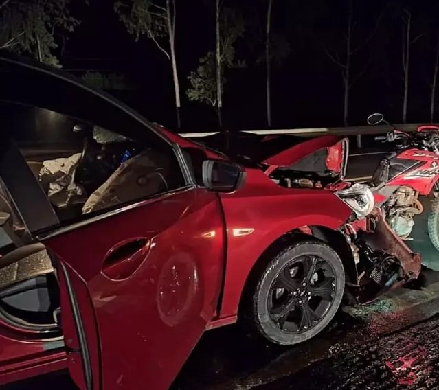 Com o impacto da colisão, a moto acabou presa no motor e capô do automóvel, sendo arrastada por aproximadamente 135 metros - ponto de parada dos veículos.