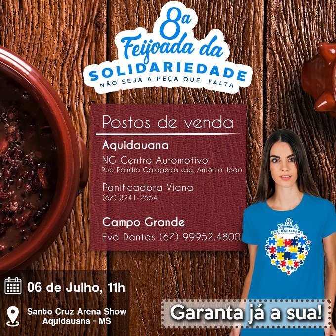 A Feijoada da Solidariedade acontecerá no sábado, 6 de Julho, a partir das 11h, no Santo Cruz Arena Show, em Aquidauana; Ingressos podem ser adquiridos na Panificadora Viana (67-3241-2654), NG Centro Automotivo, Rua Pandiá Calógeras, esquina com Antonio João, ambos em Aquidauana; e em Campo Grande pelo telefone (67-99952-4800), com Eva.