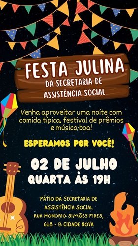 A Secretaria Municipal de Assistência Social está nos preparativos finais para a realização da 1ª Festa Julina da Secretaria, que acontece no próximo dia 2 de julho, quarta-feira, a partir das 19h, no pátio da própria Secretaria, localizada na Rua Honório Simões Pires, 618, no bairro Cidade Nova.
