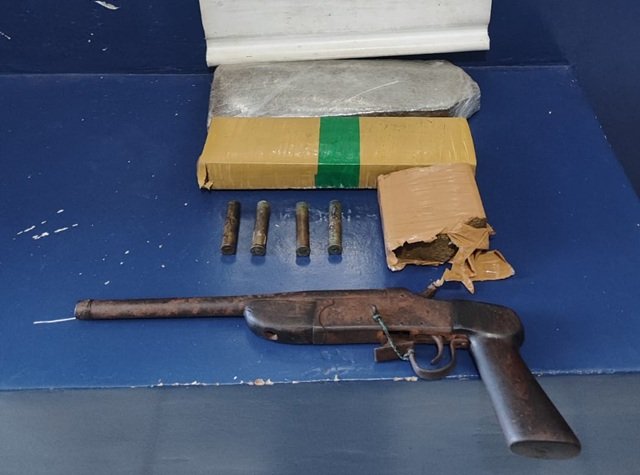 No local, os policiais encontraram 2,5 kg de substância análoga a maconha e uma arma de fogo calibre .32 com quatro munições intactas.