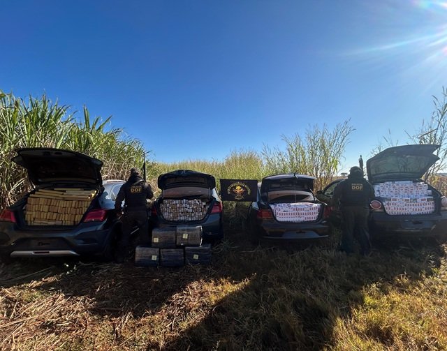 Durante diligências, os policiais localizaram em uma área de plantação de cana-de-açúcar um VW Polo e um VW Voyage carregados com cigarros contrabandeados, além de um GM Onix e um GM Prisma com maconha. Em um segundo ponto, foram encontrados um GM Cobalt, um Renault Fluence e um GM Classic.