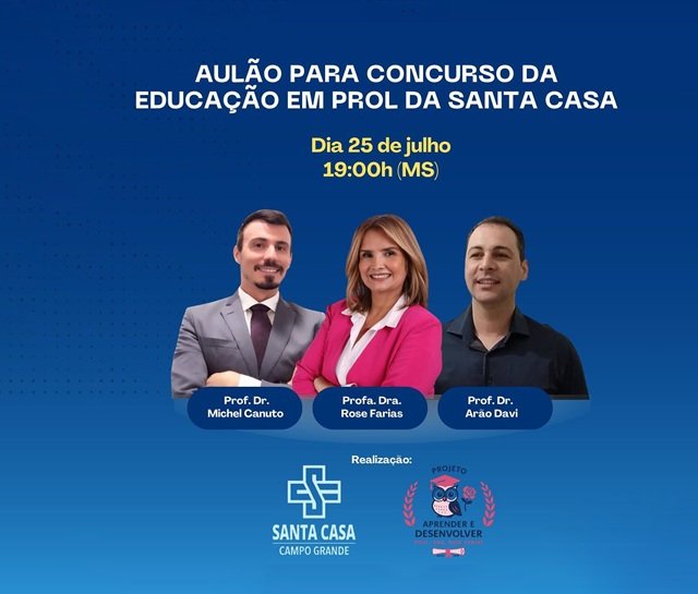 Campo Grande (MS) — Amanhã, dia 25 de julho, às 19h, o Projeto Aprender e Desenvolver - Profª Drª Rose Farias promoverá um aulão solidário voltado para concursos na área da educação, com um objetivo nobre de arrecadar fundos para a reforma do pronto-socorro da instituição.