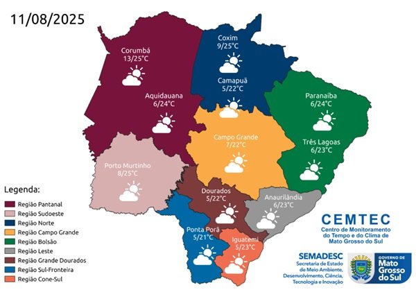 Conforme o Cemtec (Centro de Monitoramento do Tempo e do Clima), as menores temperaturas do dia, de 5 °C a 6 °C, devem ser registradas em Dourados, Iguatemi e Ponta Porã. Anaurilândia, Três Lagoas e Camapuã terão mínimas de 8 °C, enquanto Campo Grande e Aquidauana também devem amanhecer com 8 °C, respectivamente.
