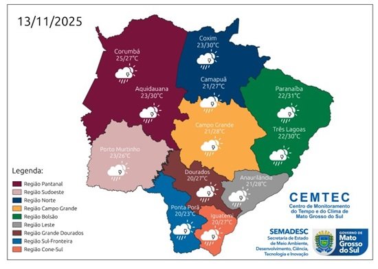 Quinta-feira (13) amanheceu com o mesmo recado para praticamente todo o Mato Grosso do Sul: leve o guarda-chuva. Segundo o mapa divulgado pelo Cemtec (Centro de Monitoramento do Tempo e do Clima), o estado será palco de um festival de nuvens carregadas, relâmpagos e pancadas de chuva ao longo do dia.