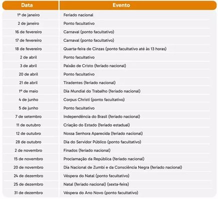 Depois tem Finados em 2 de novembro, Proclamação da República no dia 15 e o Dia Nacional de Zumbi em 20. Os últimos do ano são 24 de dezembro, véspera de Natal (ponto facultativo), e 25 de dezembro, Natal (feriado nacional), além de 31 de dezembro, véspera de Ano-Novo (ponto facultativo).