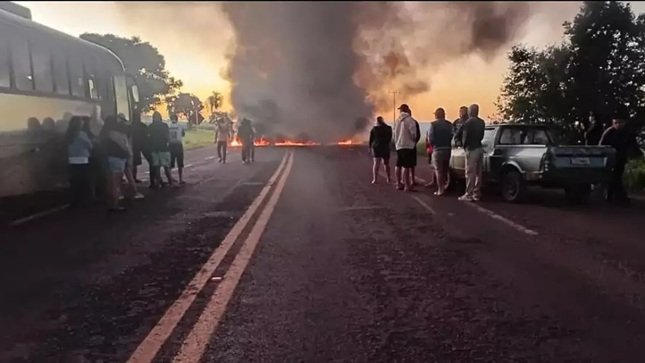 Troncos e galhos de árvore em chamas foram usados por indígenas da Aldeia Buriti para bloquear a rodovia MS-162, em Sidrolândia, como protesto por melhores condições na via e em estradas vicinais da região. O ato começou por volta das 3h30 desta sexta-feira (19) e terminou às 10h.