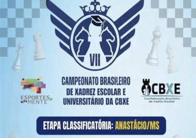O município de Anastácio será sede, no mês de março, de uma etapa classificatória do VII Campeonato Brasileiro de Xadrez Escolar e Universitário, promovido pela Confederação Brasileira de Xadrez Escolar (CBXE). A competição será disputada nos ritmos Blitz e Rápido e reunirá enxadristas de diversas categorias.