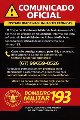 O Corpo de Bombeiros Militar de Mato Grosso do Sul informou que a unidade de Aquidauana enfrenta instabilidade nas linhas telefônicas, situação que pode dificultar, temporariamente, o atendimento de chamadas pelo número de emergência 193.