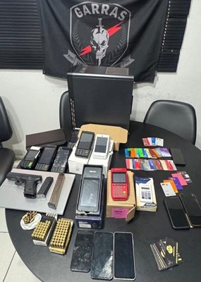 Durante as diligências, foram apreendidos: uma arma de fogo (pistola Glock) com adulteração de numeração; um carregador de pistola comum; um carregador de pistola prolongado; aproximadamente 100 munições de arma de fogo, calibre 9mm; oito máquinas de cartão de crédito; aproximadamente 40 cartões de créditos em nome de indivíduos diversos; um veículo importado; aparelhos celulares; computadores, entre outros objetos.