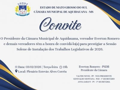 Ao convidar a população para prestigiar a cerimônia, Everton Romero ressaltou que 2025 foi um ano de conquistas e transparência, no qual a Câmara se dedicou a aprovar projetos e promover ações voltadas ao desenvolvimento do município. “Estamos preparados para manter a eficiência e contribuir de forma positiva com Aquidauana neste ano de 2026”, afirmou o presidente.