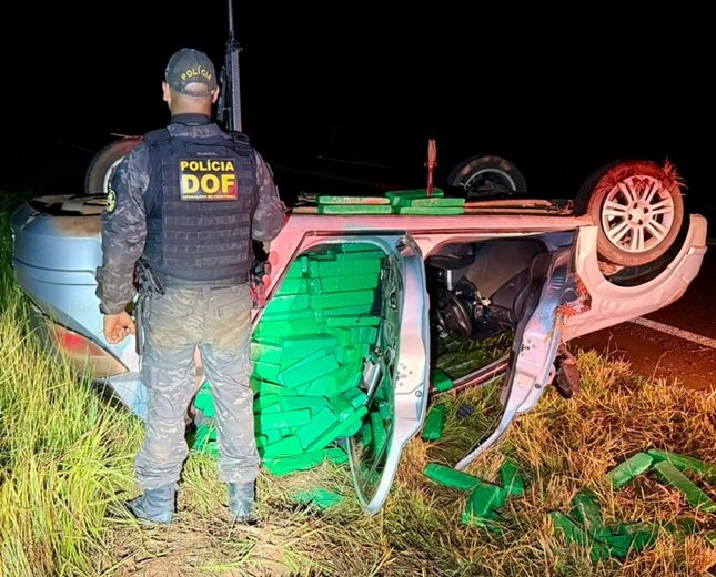 .Um jovem de 20 anos foi preso nesta quinta-feira (29) após tentar fugir de uma abordagem do DOF (Departamento de Operações de Fronteira) e capotar o veículo que conduzia, carregado com 1.080 quilos de maconha.