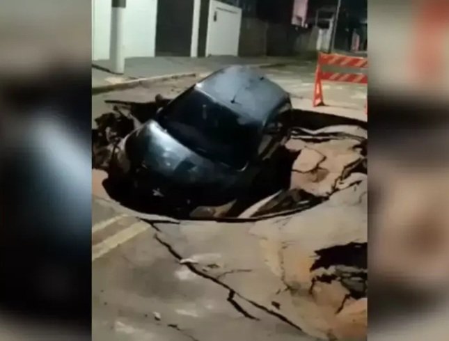 De acordo com informações apuradas no local, a via estava devidamente sinalizada com cavaletes e grades, indicando a interdição total do tráfego. Ainda assim, o condutor teria avançado pela calçada na tentativa de atravessar a área bloqueada. O veículo acabou caindo na cratera e ficou completamente preso no buraco. Com o impacto, a abertura no asfalto aumentou ainda mais.