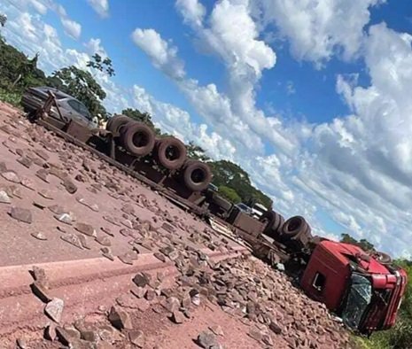 Carreta carregada com minério tombou no fim da manhã desta quinta-feira (12) e interditou quase completamente a BR-262, no km 707, trecho entre Miranda e Corumbá, nas proximidades da ponte sobre o Rio Paraguai, na região do Porto Morrinho.