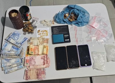 Durante as buscas, os policiais encontraram no interior da residência porções de droga do tipo pasta base, uma balança de precisão, diversos envelopes plásticos utilizados para embalar entorpecentes destinados à comercialização, além de dinheiro em espécie e aparelhos celulares.