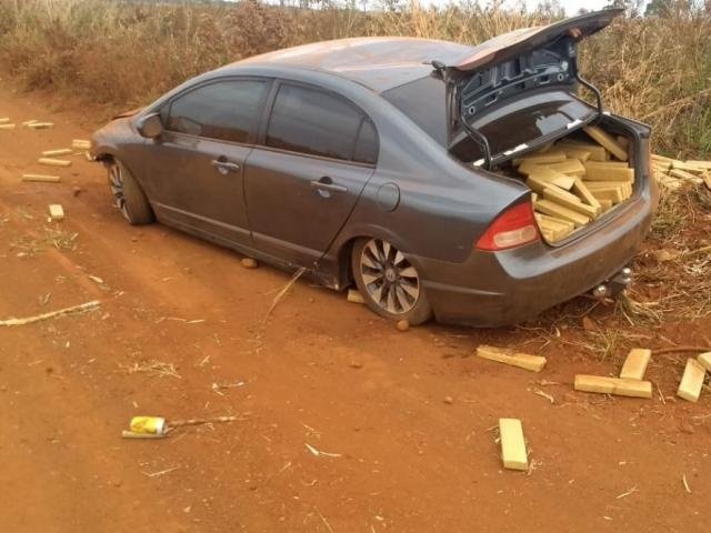 O Civic cinza usava placa falsa de Dourados e carregava 35 sacos de maconha. Os policiais localizaram rádios de comunicação instalados nos dois veículos.