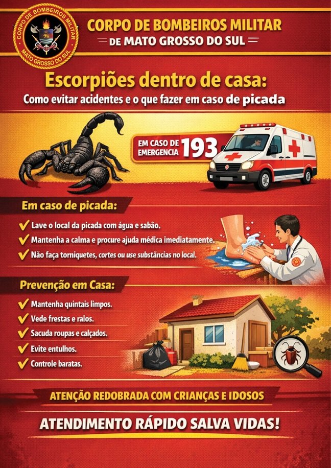 O Corpo de Bombeiros Militar de Mato Grosso do Sul orienta que, em caso de picada de escorpião, a vítima deve procurar atendimento de saúde imediatamente, dirigindo-se à unidade mais próxima, seja uma Unidade Básica de Saúde (UBS) ou uma Unidade de Pronto Atendimento (UPA), para avaliação clínica.