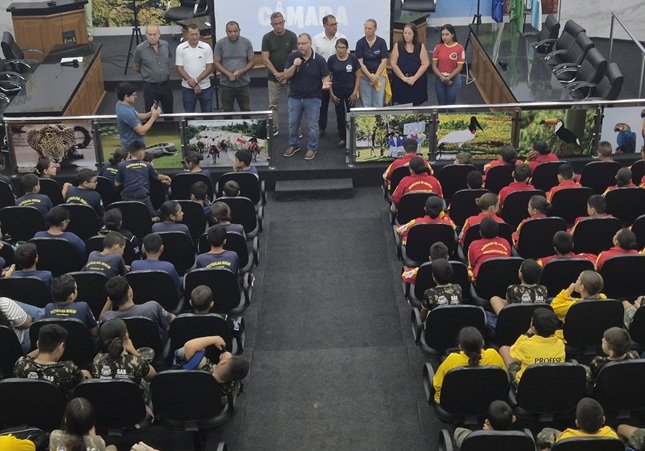 Organizados e acompanhados por seus coordenadores, alunos dos projetos Bombeiros do Amanhã, Patrulha Mirim e Pelotão Esperança participaram do evento e se acomodaram no plenário para prestigiar a primeira sessão da iniciativa.
