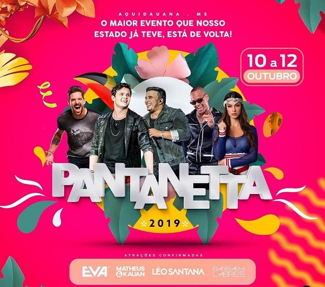 A Pantaneta está de volta e retoma a tradição com grandes nomes do circuito nacional. Banda Eva, Matheus & Kauan, Léo Santana e Bárbara Labres são as atrações confirmadas para o espetáculo que terá três dias de muita festa. O local das apresentações continua sendo na Avenida Pantaneta.