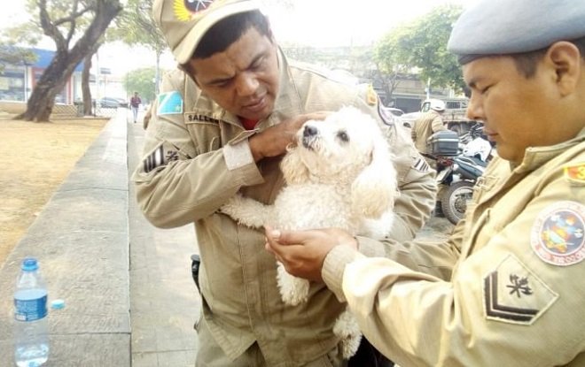 Pessoas que viram o cão preso dentro do carro chamaram o Corpo de Bombeiros, que foi até o local. Os militares forçaram o vidro traseiro do veículo e conseguiram tirar o bichinho, que parecia estar cansado e com muita sede. Os Bombeiros ofereceram água para hidratar o animal.