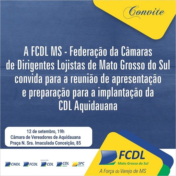 A FCDL MS - Federação da Câmara dos Dirigentes Lojistas de Mato Grosso do Sul realiza hoje, quinta-feira (12), a partir das 19hs, na Câmara de Vereadores de Aquidauana, uma reunião de apresentação e preparação para a implantação da CDL – Câmara de Dirigentes Lojistas de Aquidauana.