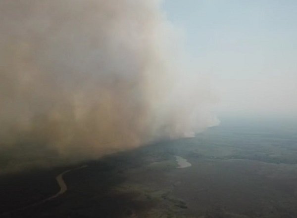 Na semana passada, um incêndio florestal que havia começado em outra fazenda atravessou o Rio Aquidauana e, com os ventos fortes e o tempo seco, se espalhou rapidamente pela Caiman, atingindo proporções nunca vistas.