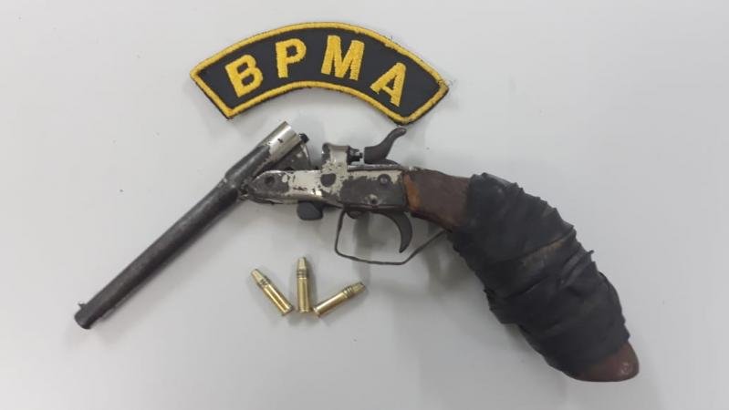 A PMA avistou o pescador que percebeu a aproximação dos Policiais Militares para abordá-lo e fugiu pela mata. Foram encontradas duas varas de pesca com molinete e uma mochila, onde havia uma arma de fogo do tipo garrucha, calibre 22 e três munições intactas do mesmo calibre.