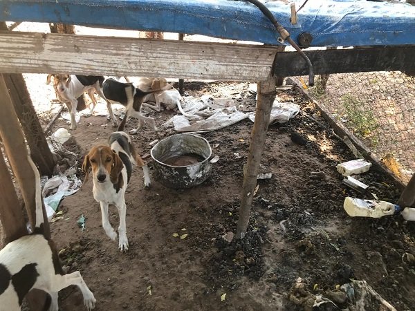 Outros cães encontravam-se amarrados em troncos de árvores e a outros pontos fixos, com corda de comprimento reduzido, para que não se movimentasse muito. O restante dos cachorros estavam presos em cômodos de um imóvel de alvenaria próximo à casa do investigado, que tinha função de depósito.
