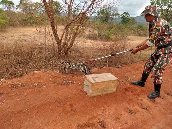 A PMA foi ao local e verificou que se tratava de um animal silvestre da espécie Felis pardalis, ou Leopardus pardalis (jaguatirica). A equipe capturou o animal com uso de cambão e o colocou em uma caixa de contenção.
