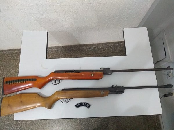 Ainda no local, a jovem, de 16 anos, informou à guarnição de serviço, que seu pai possuía em sua residência duas armas de fogo, sendo posteriormente constatado que se tratava de duas Espingardas de Pressão, sendo uma delas, adaptadas para o calibre .22.