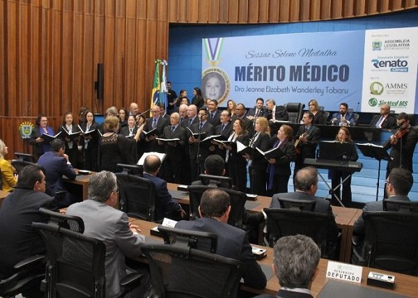 A solenidade, alusiva ao Dia do Médico, comemorado em 18 de outubro, é prevista na Resolução 26/2012, que instituiu a honraria. No início do evento, os participantes prestigiaram a apresentação do Coral da ALEMS, que cantaram as músicas Recuerdos de Ypacarai e Aquarela do Brasil. “Essa sessão é de suma importância, devido aos trabalhos relevantes que temos na área da Saúde. Realizamos essa homenagem todos os anos e, desta vez, a propositura é do Renato Câmara, com aprovação dos 24 deputados da Casa”, afirmou o presidente do Parlamento, deputado Paulo Corrêa (PSDB).