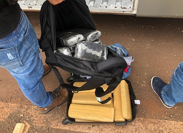 Em abordagem a um ônibus intermunicipal, em vistoria ao compartimento de bagagem, a equipe localizou uma mala com dez tabletes de maconha.