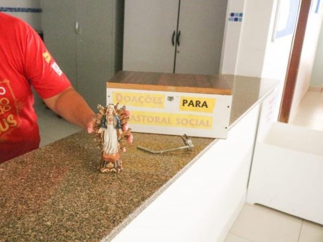 A caixinha fica sob uma imagem de Maria, que foi preservada pelo bandido. No local não havia câmeras de segurança.