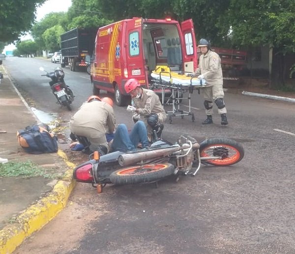 Motociclista do sexo feminino ainda não identificada foi atendida pelo Corpo de Bombeiros e removida para o Pronto Socorro do Hospital Regional de Aquidauana com possível fratura no braço.