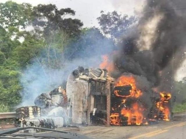 Carreta que tombou em acidente foi destruída pelo fogo (Foto: O Correio News)