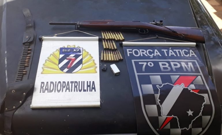 Questionado sobre possíveis armas e mais munições no local, o homem negou, mas as equipes cumpriram a ordem judicial e realizaram buscas no imóvel, encontrando em cima de seu guarda-roupas enrolado em um pano, um Fuzil ‘Mosque Fal de ferrolho’ característico de calibre .30, de uso restrito, com capacidade para cinco munições.