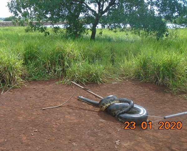 Depois de algumas horas, a sucuri foi capturada e em seguida foi solta em seu habitat natural, em uma vegetação às margens do córrego Indaiazinho.