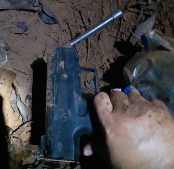 Ao mexer na terra, e percebendo que alguém teria há pouco tempo enterrado algo, os policiais cavaram e conseguiram achar uma arma de fogo do tipo garrucha, calibre .22.