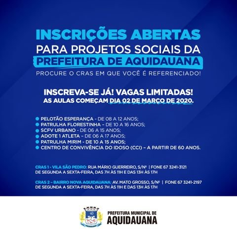 A Secretaria Municipal de Assistência Social informa que estão abertas as inscrições para os projetos sociais com crianças, adolescentes e idosos em Aquidauana. As atividades dos projetos já iniciam na primeira semana de março.