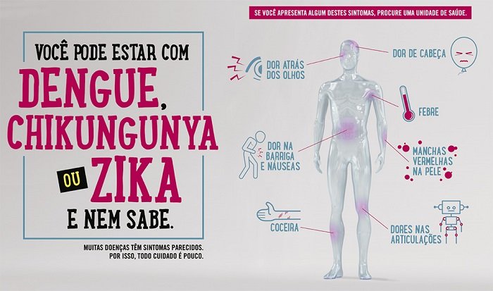 Se você apresentar febre acompanhada de dor atrás dos olhos e na barriga, náuseas, coceira, dor de cabeça, manchas vermelhas na pele ou dores nas articulações, procure uma unidade de saúde. Você pode estar com dengue, chikungunya ou zika. O Ministério da Saúde alerta que muitas doenças têm sintomas parecidos, então é importante ficar atento aos primeiros sinais e procurar rapidamente uma unidade de saúde.