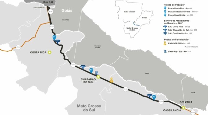 Na prática, isso significa pista duplicada, acostamento, serviços como socorros médico e mecânico, inspeção de tráfego, combate à incêndio e retirada de animais da pista, entre outros. Já a cobrança de pedágio irá acontecer apenas após um ano. A estimativa é de 3 mil veículos circulando pela rodovia por dia. Ao todo, a MS-206 receberá três praças de cobrança, com tarifa básica de R$ 8,72.