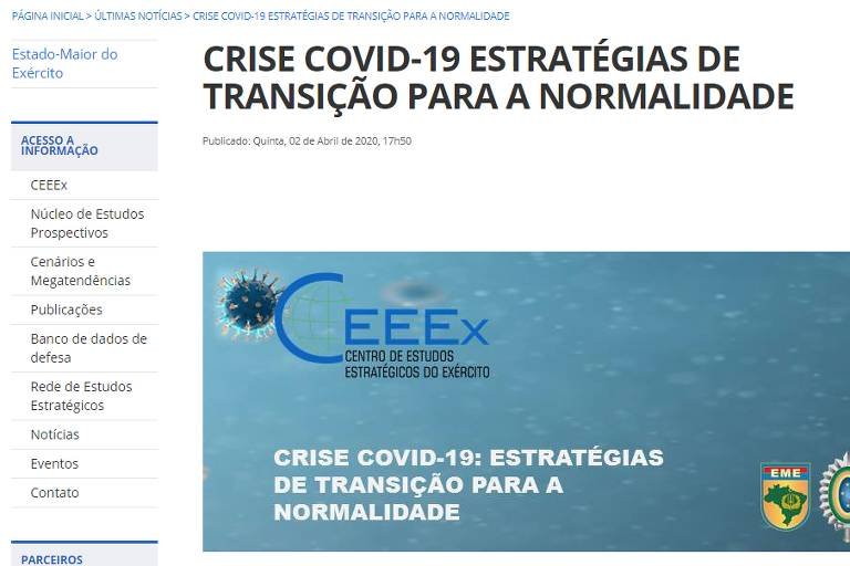 Desde esta segunda-feira (6), o site do Centro de Estudos Estratégicos do Exército (CEEEx) está fora do ar. O órgão, que é subordinado ao Exército, publicou na última quinta-feira (2) estudo indicando o isolamento horizontal como forma de combater o coronavírus.
